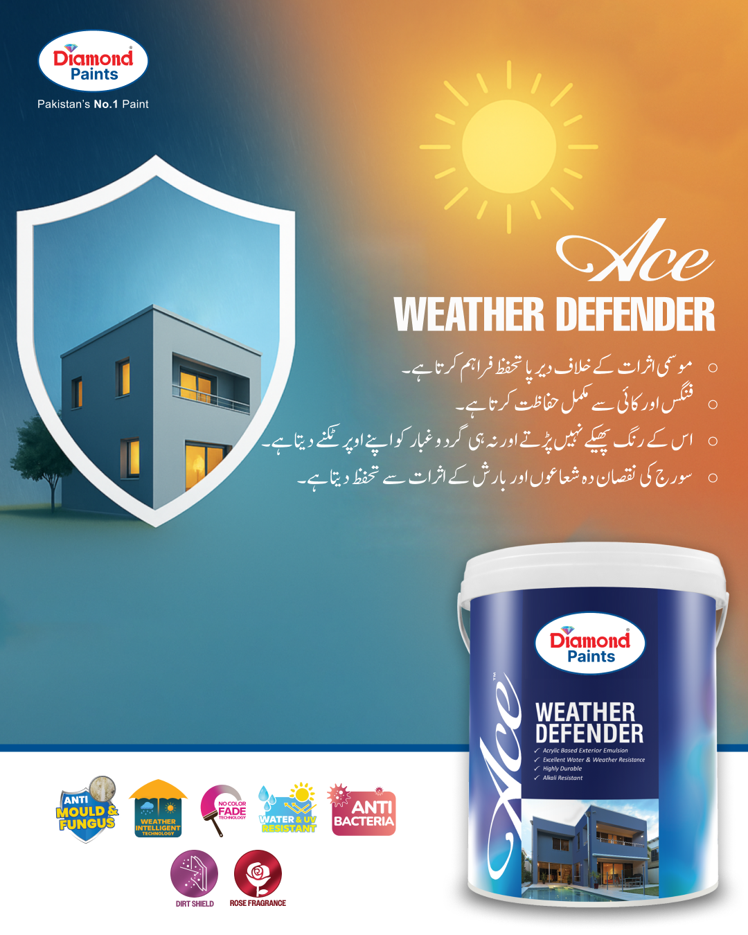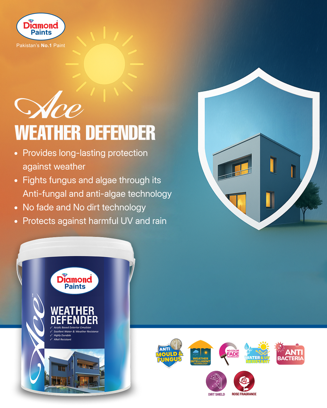 Diamond Ace Weather Defender provides complete protection for the beautiful exterior walls of your dream house. Available in the widest range of vivid and vibrant shades, it is a premium quality acrylic-based emulsion that provides long-lasting protection against weather changes and water. Its enhanced formula is alkali resistant and protects against harmful UV and rain to give your walls a fresh look throughout the year. Ace Weather Defender is specially formulated for durability and fights fungus and algae through its anti-fungal technology to extend the life of your exterior walls.