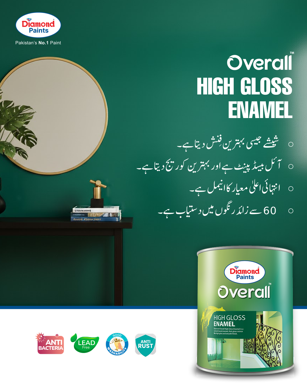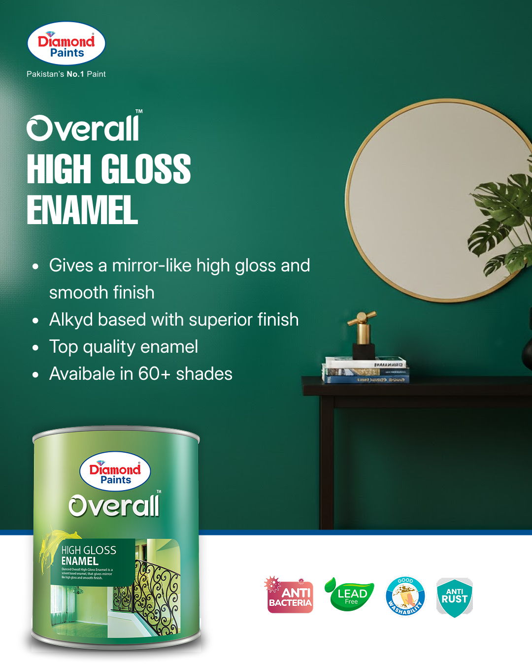 Diamond Overall High Gloss Enamel is a top-quality oil-based paint made from the highest quality resin. It produces a hard, durable gloss finish and maximum gloss retention. It has good brush-ability and opacity. It can be scrubbed hard. It is suitable for both interior and