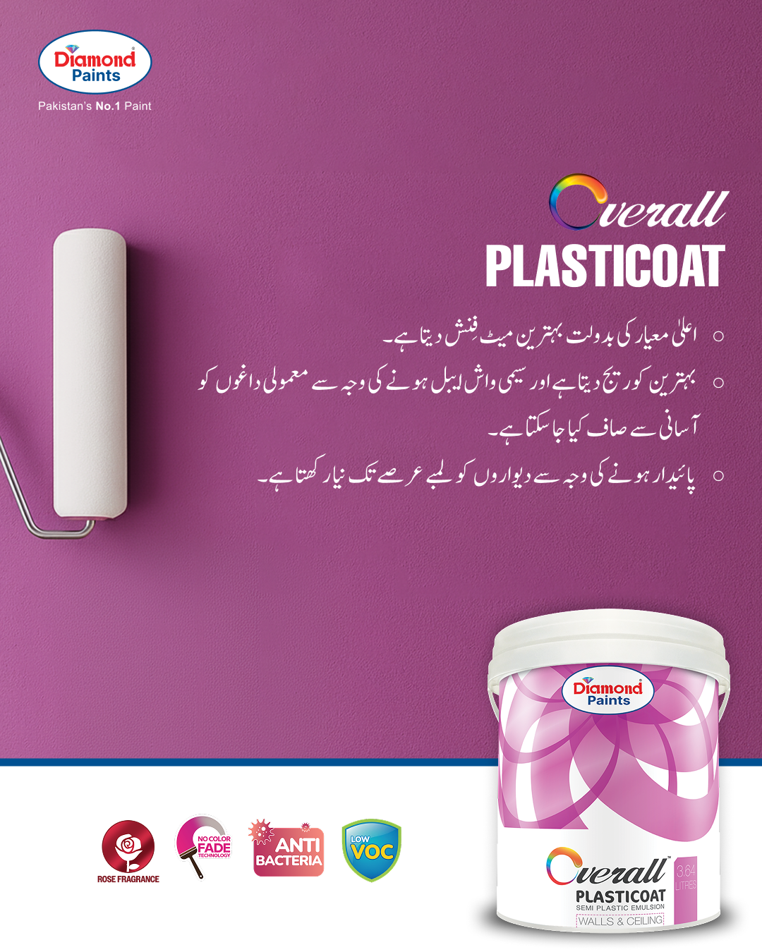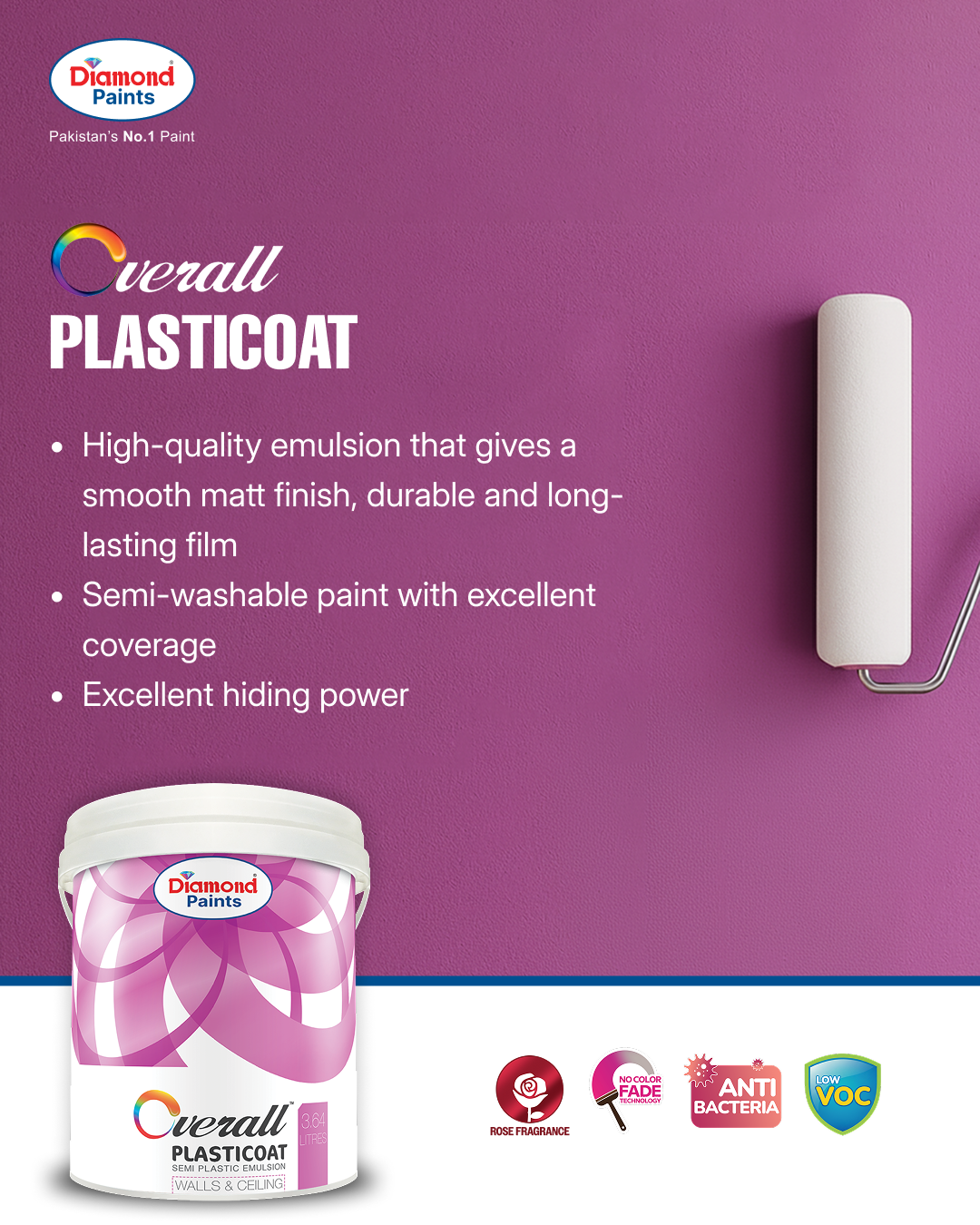 ڈائمنڈ اوور آل پلاسٹک کوٹ ایملشن ایک معیاری اور کم قیمت سیمی پلاسٹک ایملشن پینٹ ہے جو بہترین کوریج اور میٹ فنش فراہم کرتا ہے۔ یہ اندرونی دیواروں، کنکریٹ اور پلاسٹر کے لیے موزوں ہے۔
